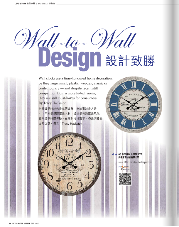掛牆鐘是時計也是家居裝飾, 無論形狀是大是小, 用料是塑膠還是木材, 設計是典雅還是現代, 都能經受時間考驗, 在高科技挑戰下, 扔是消費者必然之選